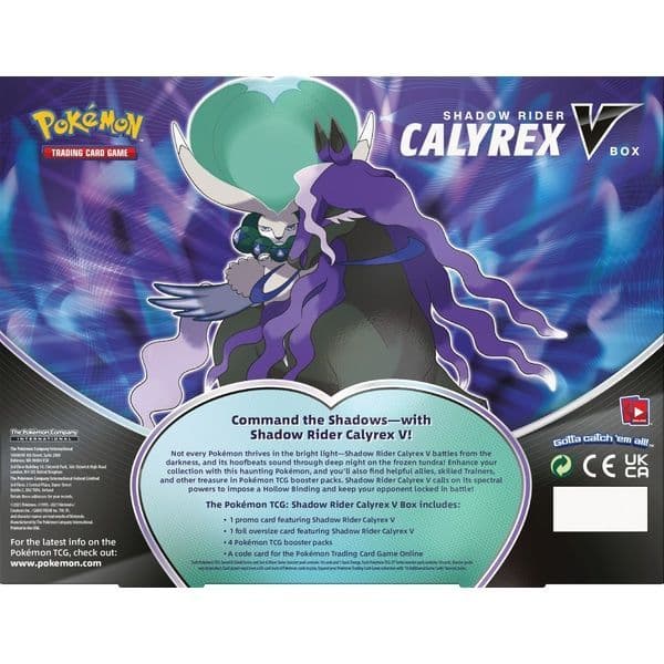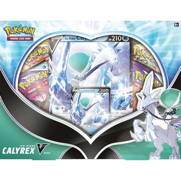 Command the frozen lands of the Crown Tundra and harness the power of Ice Rider or Shadow Rider Calyrex! Each Pokemon TCG Calyrex V Box includes: 1 promo card featuring Ice Rider or Shadow Rider Calyrex, 1 foil oversize card featuring Ice Rider or Shadow Rider Calyrex, 4 x Pokemon TCG booster packs, a code card for the Pokemon Trading Card Game Online.